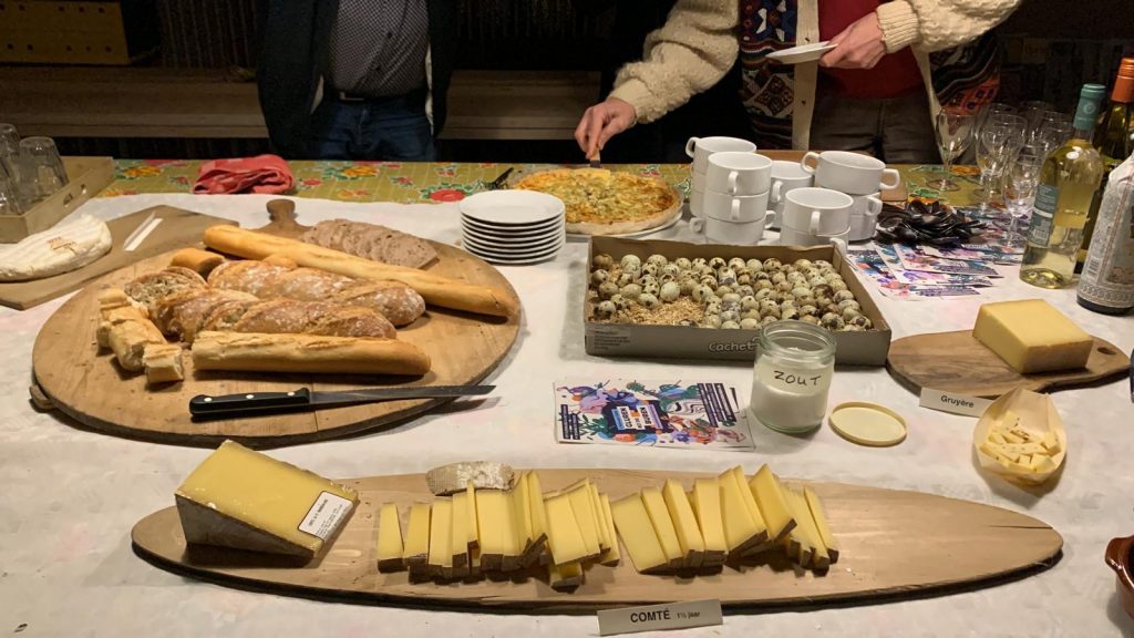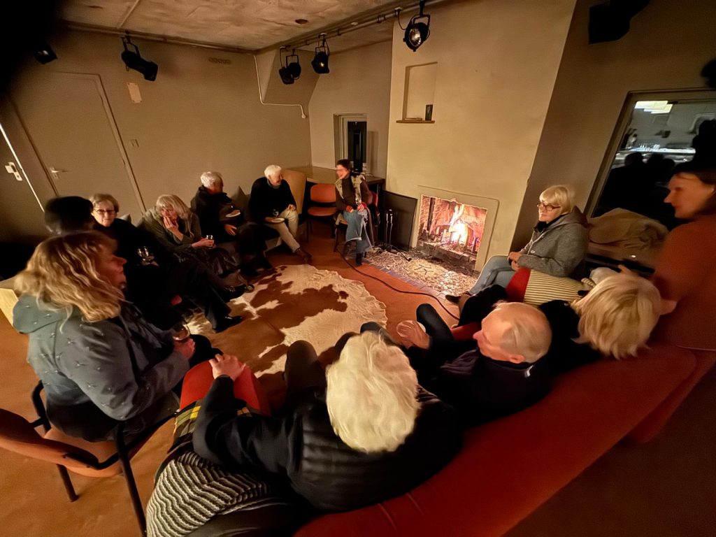 Na afloop van de film gezellig samenzijn onder het genot van guiches, vele heerlijke kazen, kwarteleitjes uit de Betuwe, stokbrood, en een wijntje. Gezellig rond de open haard van Thedinghsweert.