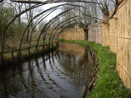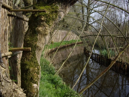 Vijver en vangpijpen zijn door een systeem van rietmatten afgeschermd van het pad rondom de vijver, zodat de kooiker zich ongezien kan bewegen.