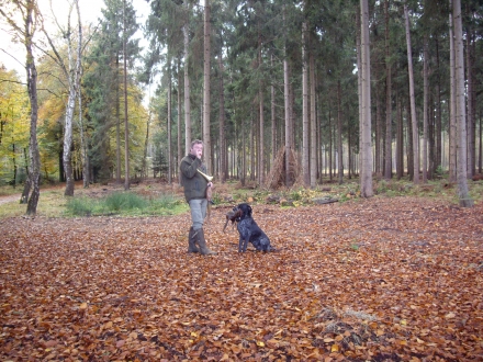 Hierna demonstreerde Jan de Groot, met hulp van dochter Marieke, hoe zijn hond Black de kunst en kunde van het apporteren van wild beheerst: