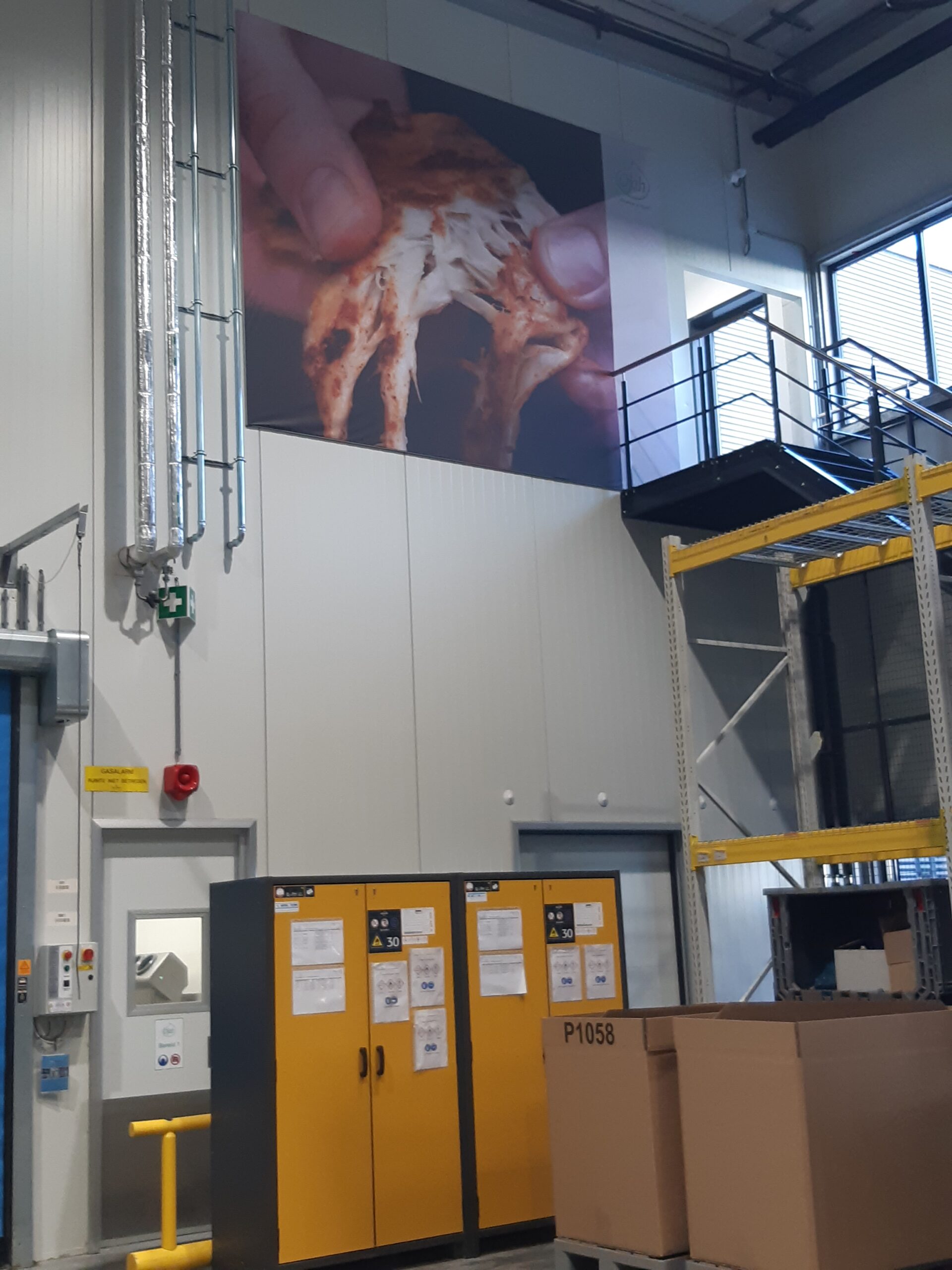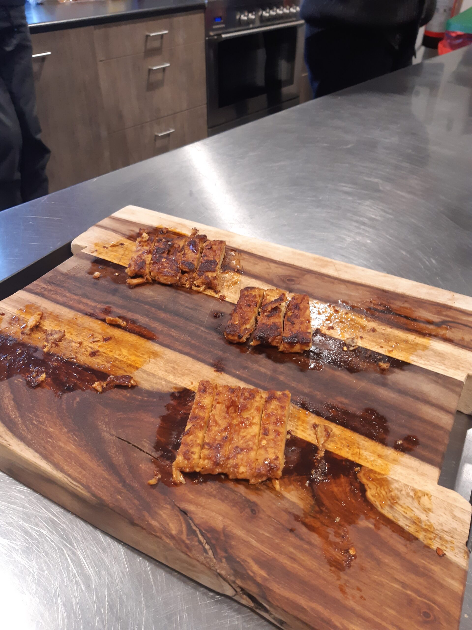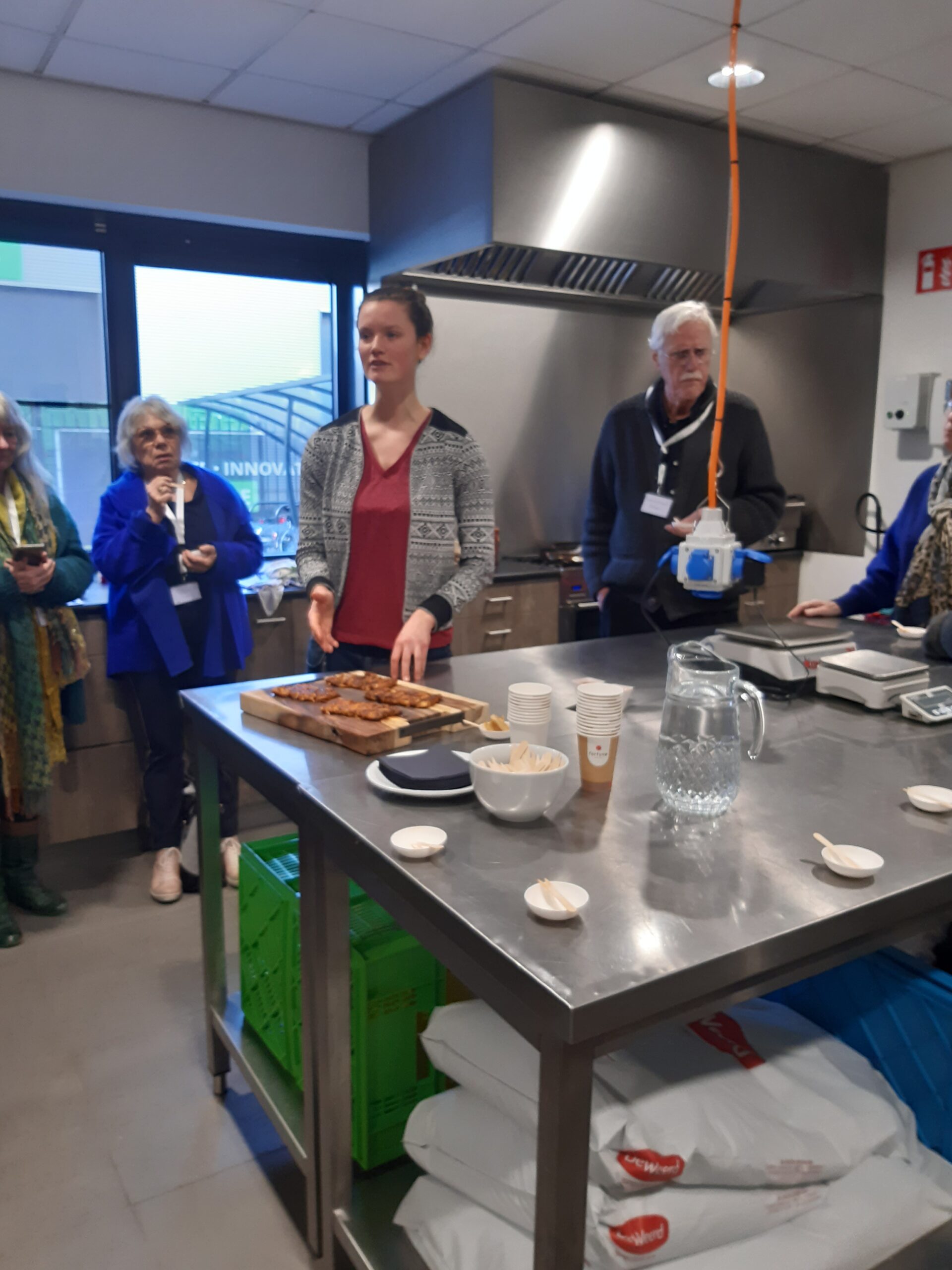 Aansluitend werd ons in de Research en Development Kitchen de gelegenheid geboden enkele producten te proeven, een stukje “kip”, een stukje “varkensvlees” en een gefrituurde “kippenvleugel”.