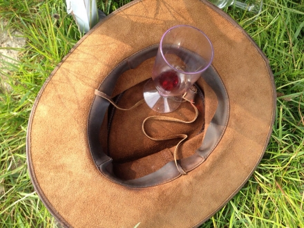 En de oplossing om je wijnglas in het gras veilig te stellen is: in je chapeau!