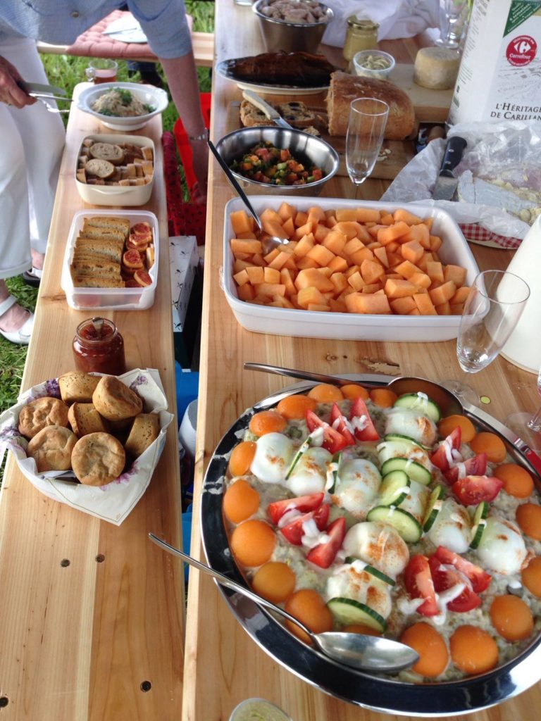 Een Brabantse salade, meloenblokjes, asperges met ham, zelfgebakken olijvenbrood, drie verschillende vissalades van haring-, makreel- of zalm, stukjes varkensvlees van het spit, kaasjes en crostini, coleslaw in twee variaties en ter plekke gebakken Ćevapčići (Servische gehaktrolletjes) met zelfgemaakte of gekochte Ajvar (paprika/aubergine/knoflook puree); –proef het verschil-.
