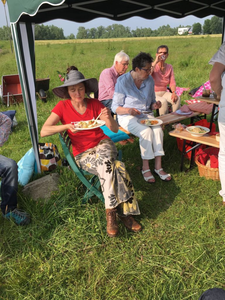 De praktijk wees uit dat stoelen toch wel wat comfortabeler zitten; de picknickkleedjes werden niet gebruikt. Alleen Robbert is op zijn eigen gelooide geitenvacht neergestreken.