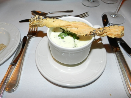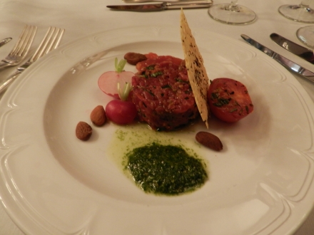 We begonnen met een taartje van Lakenvelder rund met een hartige kaas-kletskop, op prachtig opgemaakt borden, een feest voor het oog.