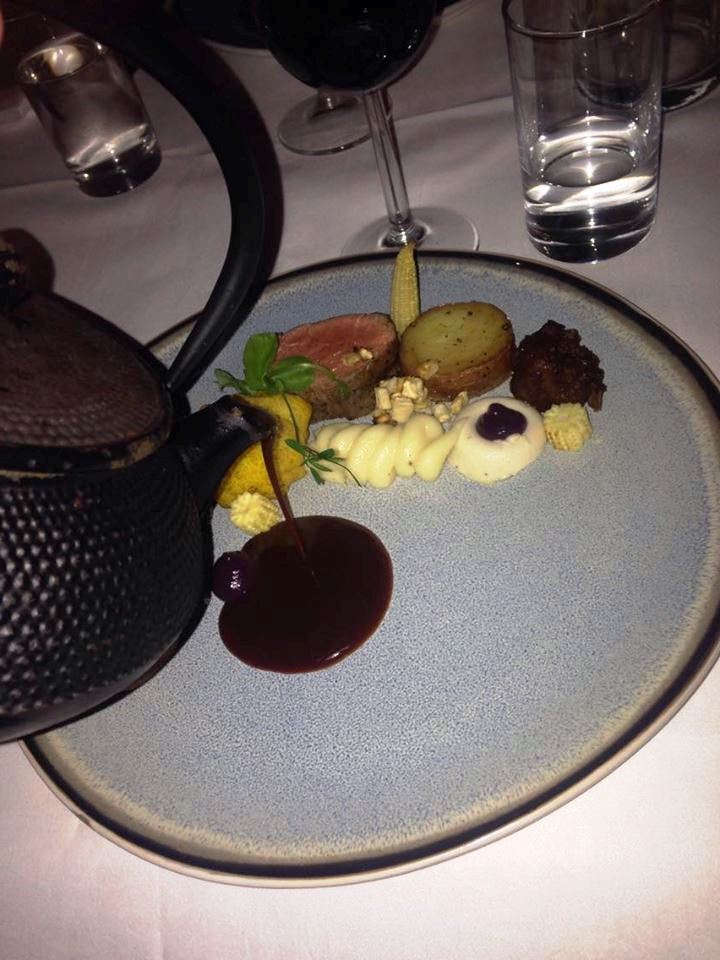 Het hoofdgerecht: een regelrecht pièce de résistance: buikspek, mooi zachtgegaard, het wangetje heel mals en een medaillon van het haasje, allemaal van het Bonte Bentheimervarken. Het begeleidend garnituur arbeidsintensief en verrukkelijk: knolselderijpuree met rodekoolgel, pastinaakpuree en bloemkool, bitterballetjes van polenta en een jus met tonen van hoisinsaus (bekend van de pekingeend). Erbij Saint Roche, een van Syrah en Grenache gemaakte Cotes du Roussillon.