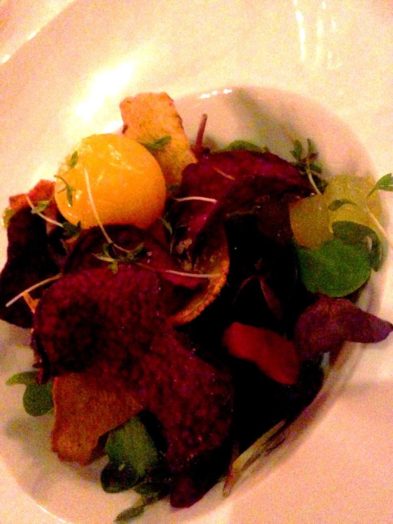 Het viergangendiner werd daarna op voortreffelijke wijze begeleid door een wijnarrangement met verrassende keuzes. Bij het voorgerecht dronken we een Albariňo. Het bordje zag er feestelijk uit: biet, wortel en pastinaak, – de tegenwoordig niet meer vergeten groenten-, gedroogd en geserveerd met met jonge sla, puree van groene paprika, een op lage temperatuur gegaarde eidooier en een dressing met onder meer het Aziatische 5-kruidenpoeder.