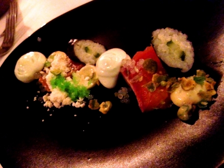 Het tussengerecht werd begeleid door een Chardonnay uit Süd Tirol, een pareltje van Peter Zemmer. Een geweldige begeleider van het visbordje: gemarineerde zalm (MSC natuurlijk) uit Noorwegen met kuit van de vliegende vis, wasabi, komkommerschuim en sushirijst.
