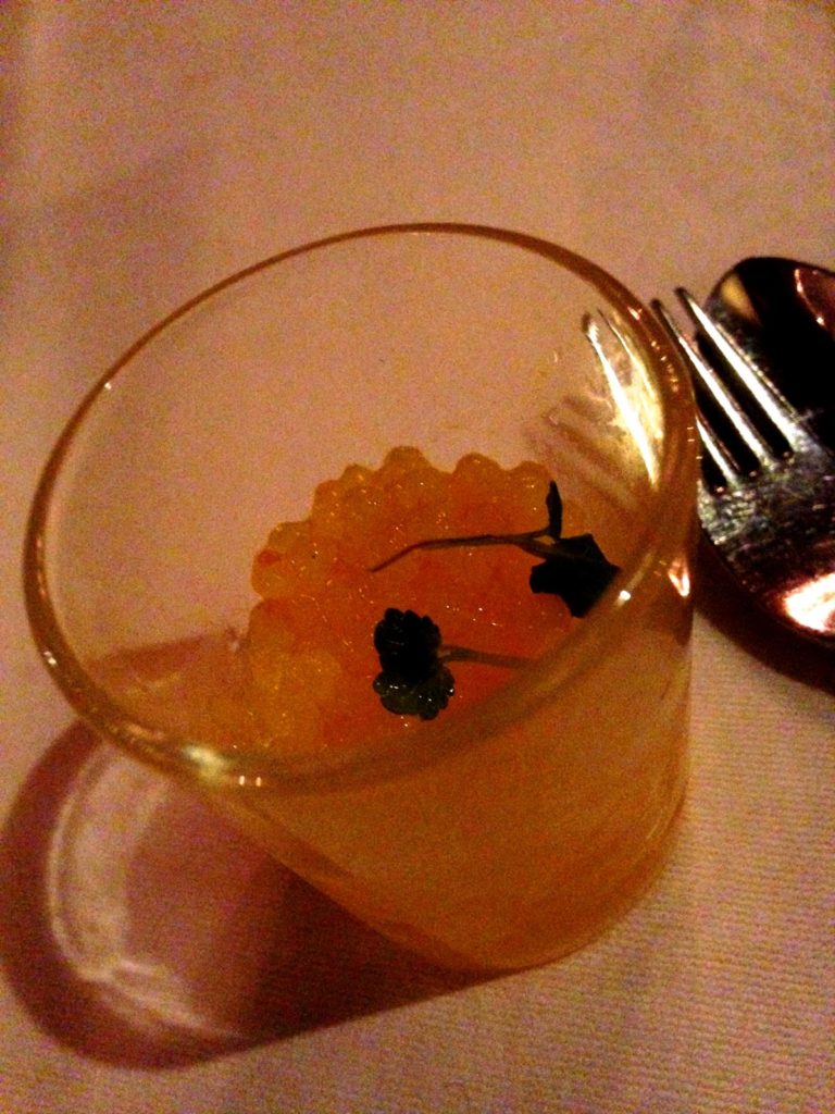 Voor we aan het dessert toekwamen nog een prédessert: Granité van mandarijn met olijfolie en tapiocakorrels. Leuk!