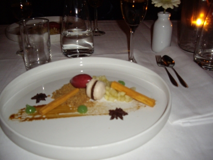 Bij het ‘echte’ dessert dronken we Beaulon, een Pineau des Charentes (een versterkte wijn op basis van Cognac en druivensap). Een mooi bordje met appelcompôte, structuren van chocola (een heus kaneelstokje van chocola!), een groene appelgelei, een macaron en een sorbet van Gluehwein; alles verrassend.