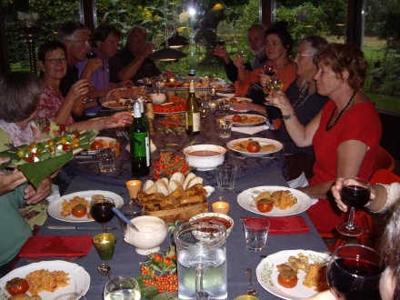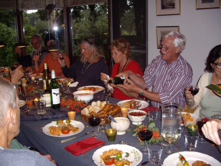 Alleen is het jammer dat niet alle gasten gehoor hebben gegeven aan het verzoek, – een bijdrage, in de vorm van een eigen favoriet tomatengerecht voor de gezamenlijke maaltijd -, waar bij de aanmelding om is verzocht.