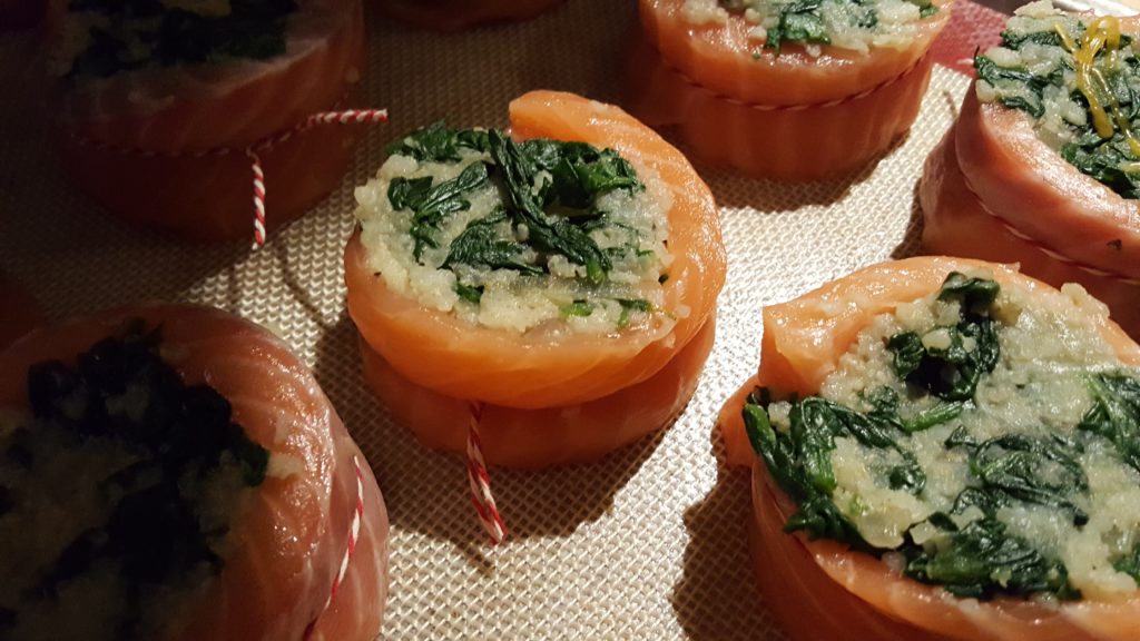 Gevulde zalm met walnoot en spinazie.