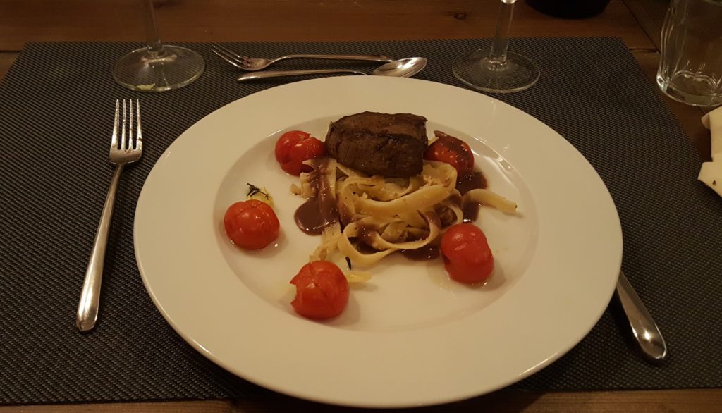 Biefstukje met walnotenpasta en tomaatjes.