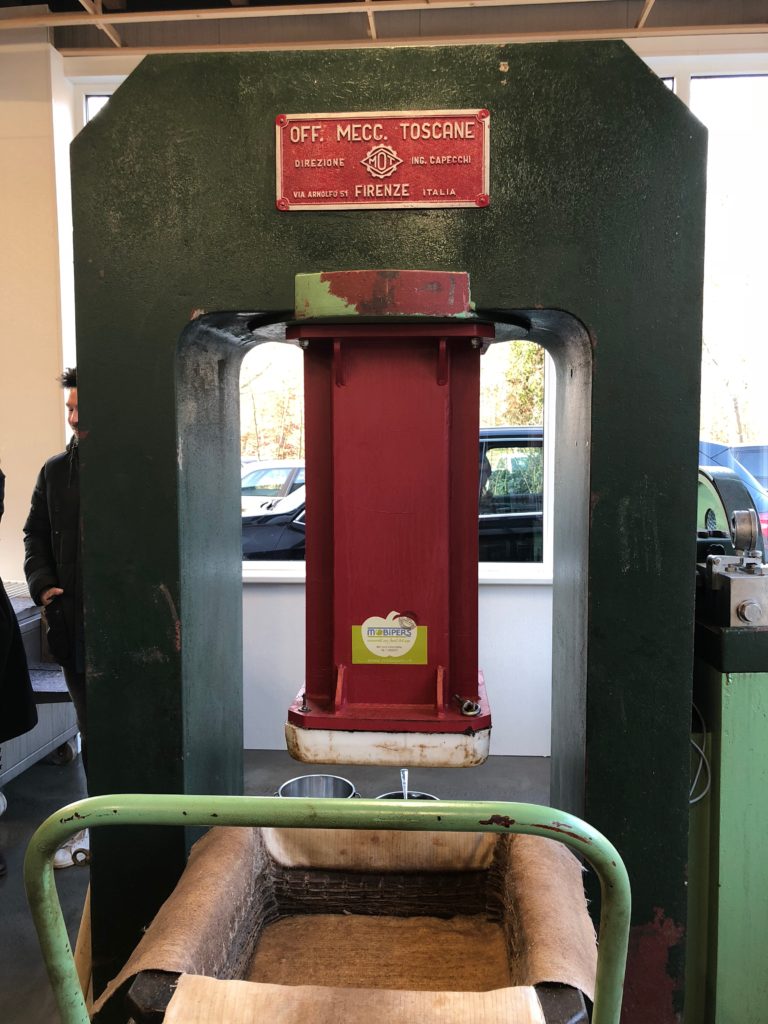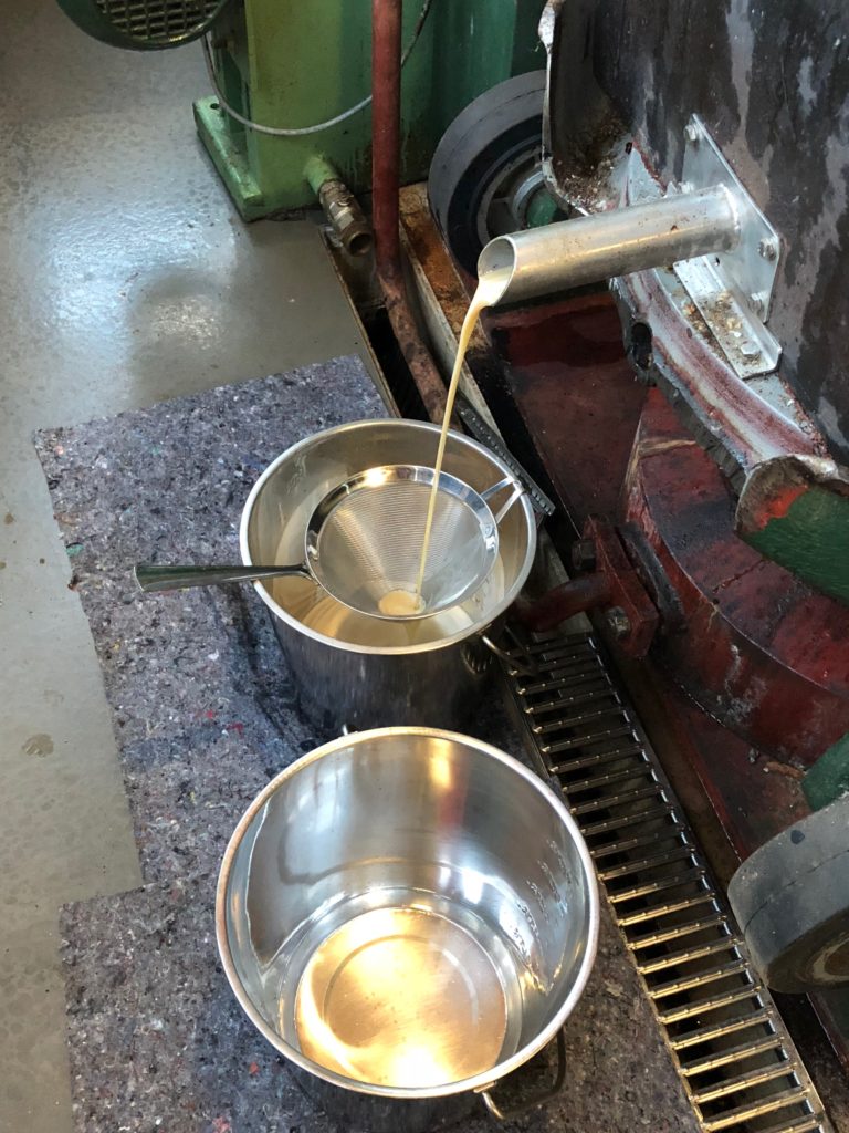 In een andere ruimte vindt het echte persen plaats. Maar eerst konden we zien hoe een partij noten vermalen werd en vervolgens geroosterd, daarna overgedaan in een grote bak, waarbij de pers vanuit de bodem omhoog geduwd werd met een kracht van 350 bar. Na enige tijd, als er voldoende druk is opgebouwd, komt het eerste stroompje olie uit de pers lopen, wat dan snel groter wordt.