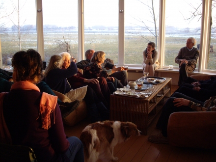 In de serre van het Waardmanshuis, met een schitterend uitzicht over een winterse Waal, werden we met thee en koffie welkom geheten door het bestuur van Convivium De Betuwe en uitgenodigd deel te nemen aan onze ALV.