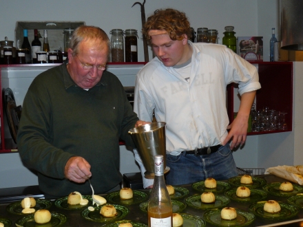 En als toetje: met noten gevulde appeltjes voorzien van een vanillesausje met granaatappel pitjes.