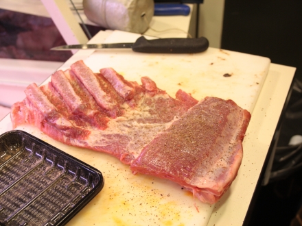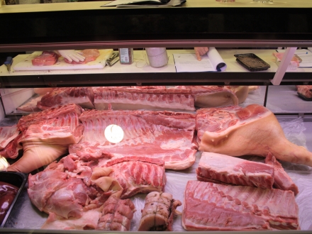 De eerste groep ging achter de winkel, in de werkruimte, aan de slag (waar ook de worstmachine staat) en de andere drie groepen werden verspreid over de winkel. Daar lag in de toonbank ook een half varken, aan de hand waarvan Bartho en Marco uitleg gaven over de verschillende stukken vlees die we gebruikten. En met behulp van zo’n half varken bleek je ook best uit te kunnen leggen waar bij een koe de jodenhaas en de longhaas zitten (want daar was een vraag over).