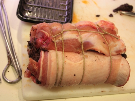 De laatste groep mocht een filet kruiden met cacaopeper (dat was voor de meesten van ons iets geheel nieuws) en daarna insmeren met, au bain marie, verwarmde chocolade. Het oprollen was geen probleem (hooguit een beetje geklieder, maar dat is met van die lekkere chocolade geen punt), maar het vervolgens netjes aanbrengen van het touwtje bleek nog niet zo eenvoudig. Toch nog maar eens oefenen.