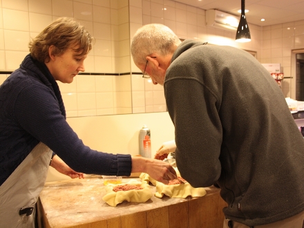 Ondertussen was in de winkel de paté-groep bezig met het bekleden van de bakjes met het geprepareerde deeg en het kruiden van de vulling. Scheutje room erbij voor het smeuïg, vulling in de beklede bakjes, dekseltje maken van de overhangende deegflapjes en een “schoorsteentje” maken. Tot slot een los-geklopt eitje erover et voilá, de paté kon de oven in.